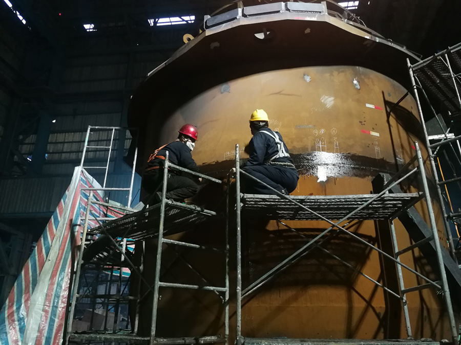 時(shí)間就是效益,滿足客戶需求,讓客戶滿意是遼寧方大集團(tuán)北方重工全體員工的共同目標(biāo)。為盡快完成轉(zhuǎn)爐項(xiàng)目現(xiàn)場(chǎng)施工,給用戶創(chuàng)造價(jià)值,焊接工人連續(xù)工作,質(zhì)檢、探傷人員緊密配合,每天早七晚十,持續(xù)作業(yè)?,F(xiàn)場(chǎng)服務(wù)人員在爐腔內(nèi)施工,作業(yè)空間密閉、狹小,但為保證質(zhì)量、節(jié)省時(shí)間,他們經(jīng)常“扎”近腔體半個(gè)小時(shí)不出來。寒冬季節(jié),當(dāng)他們從爐體鉆出來時(shí),單衣已被汗水打透。上下爐殼接口內(nèi)部焊縫焊接位置被支撐遮擋,大家只能半爬半跪的窩在支撐上進(jìn)行焊接。每前進(jìn)一步都需要用“膝蓋當(dāng)腳,一步一跪”的完成焊接工作,他們就是這樣用膝蓋丈量了整個(gè)內(nèi)部環(huán)縫的長(zhǎng)度。