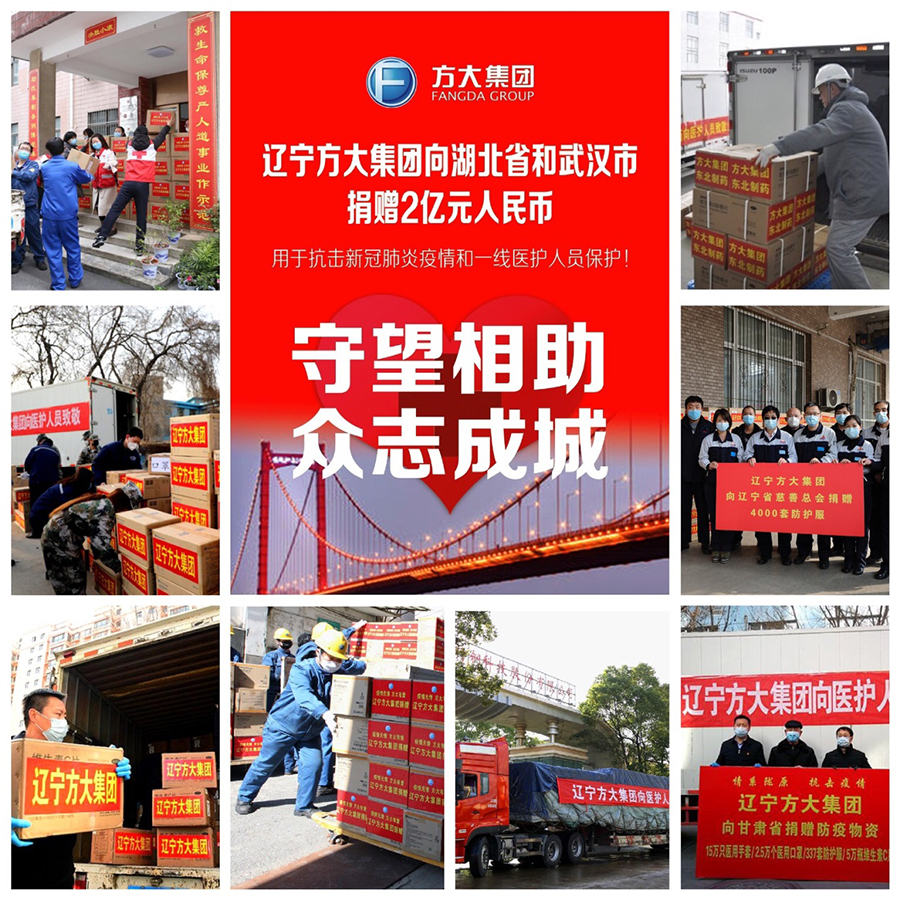 1月28日,遼寧方大集團(tuán)向湖北省和武漢市捐贈(zèng)2億元人民幣;2月2日、9日,方大群眾醫(yī)院重癥醫(yī)學(xué)科護(hù)士胡楠楠和曹寧,醫(yī)院醫(yī)生劉兆崇及護(hù)士李春、曹露、徐曉萌、萬佳彤兩批共7名醫(yī)護(hù)人員參加遼寧省馳援湖北醫(yī)療隊(duì),走上抗疫第一線;2月10日,方大集團(tuán)再次向湖北省和武漢市捐贈(zèng)當(dāng)前急需的防護(hù)服2萬套;2月7日,方大集團(tuán)向家鄉(xiāng)沈陽捐贈(zèng)急需醫(yī)用防護(hù)服;2月14日,方大集團(tuán)通過沈陽市紅十字會(huì)向沈陽醫(yī)護(hù)人員無償捐贈(zèng)26.5萬只醫(yī)用外科手套;2月16日,方大集團(tuán)從加拿大緊急采購(gòu)的3500套防護(hù)服和14950雙防護(hù)靴在運(yùn)抵沈陽后,第一時(shí)間捐贈(zèng)給遼寧省紅十字會(huì),同時(shí)捐贈(zèng)的還有30000只醫(yī)用手套;2月17日,方大集團(tuán)馳援江西10萬瓶維生素C片、5萬瓶乙醇消毒劑和50萬只醫(yī)用手套等防疫物資;2月19日,又通過甘肅省紅十字會(huì)和蘭州市政府捐贈(zèng)了5萬個(gè)醫(yī)用口罩、30萬只防護(hù)手套、674套防護(hù)服和10萬瓶維生素C防疫物資;2月24日,方大集團(tuán)再一次向家鄉(xiāng)沈陽捐贈(zèng)23800套醫(yī)用防護(hù)服,這也是新冠肺炎疫情發(fā)生以來沈陽市接受捐贈(zèng)數(shù)量最大、價(jià)值最高的一批防護(hù)服;2月25日,方大集團(tuán)又從境外采購(gòu)8000套防護(hù)服,通過遼寧省紅十字會(huì)和遼寧省慈善總會(huì)再一次捐贈(zèng)給了家鄉(xiāng)遼寧。