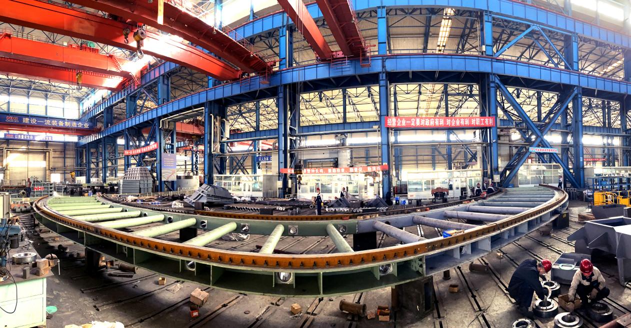 環(huán)冷機是整個項目當中結(jié)構(gòu)比較復雜的產(chǎn)品,裝配工作量大、裝配精度要求高,作為承擔此次裝配任務(wù)的冶金電站裝備分廠對此項目高度重視,他們抽調(diào)班組骨干成立項目攻關(guān)小組,預先熟悉圖紙、了解工藝要求、制定裝配方案。生產(chǎn)過程中,兩個裝配車間即比拼競賽又共同協(xié)作,真正發(fā)揮出生產(chǎn)團隊能吃苦、能戰(zhàn)斗的優(yōu)勢。面對工期短、工作量大、精度高等挑戰(zhàn),他們將解決困難的突破口定位在車間回件初期上,沒完成工序的零部件回到車間立刻安排人員將工序完成,從源頭上杜絕“等、靠、要”的老舊思想觀念,爭分奪秒的為后續(xù)裝配留出時間。為順利完成裝配任務(wù),總裝車間、技術(shù)、質(zhì)檢、生產(chǎn)等多部門協(xié)同作戰(zhàn),各部門積極響應,一起加班加點,創(chuàng)造出每天能完成裝配四個回轉(zhuǎn)體框架臺車的裝配記錄!